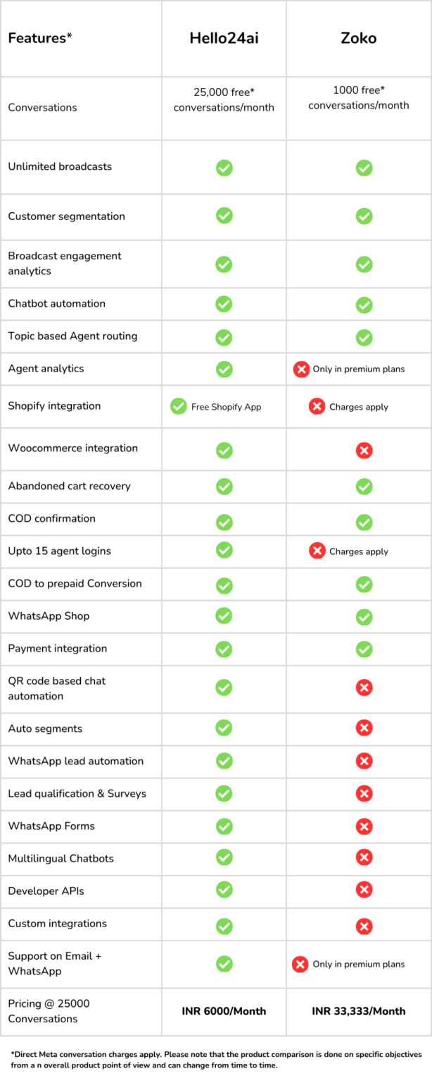 No setup charges | 25000 Free* Conversations/Month | Free Guided onboarding | Free Shopify & WooCommerce to WhatsApp integration | Connect Facebook Messenger & Instagram DMs to One Inbox